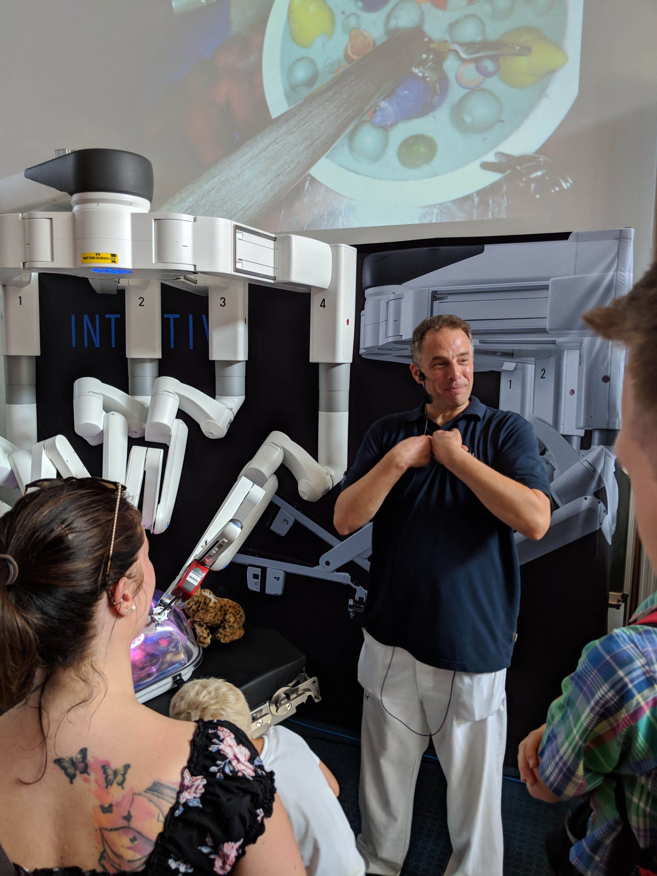 Münster (ukm/aw) – Die „Lange Nacht der Robotik“ geht nach dem großen Erfolg im Jahr 2019 in eine zweite Runde. Am Freitag, 26. August, präsentiert die Klinik für Allgemein-, Viszeral- und Transplantationschirurgie am UKM (Universitätsklinikum Münster) zwischen 16.00 und 22.00 Uhr der Öffentlichkeit im Hörsaal an der Waldeyerstraße einen Hightech-Operationsroboter mit mehreren Konsolen und einem Simulator. Durch das Programm führt Robotik-Experte Dr. Jens Peter Hölzen. Die Veranstaltung richtet sich ausdrücklich auch an Familien mit Kindern. An einem vollständigen daVinci Xi-System® werden zum Beispiel unblutige live-Vorführungen von Operationen am Kuscheltieren zu sehen sein. Die UKM-Experten demonstrieren die Präzision dieser Technologie unter anderem an einer geschälten Weintraube, die anschließend wieder zusammengenäht wird. „Wir werden erneut mit vielen spielerischen Demonstrationen unsere Besucher zum Staunen bringen!“, freut sich Hölzen auf die Veranstaltung, die angesichts der Pandemie einem besonderen Hygiene-Konzept unterliegt. Mit ausreichend Abstand und gestaffelten Time-Slots bekommen Interessierte die Gelegenheit, selbst einmal den Roboter unter Anleitung zu steuern. An einer weiteren Roboter-Konsole können die Gäste am daVinci®-Simulator üben und sich in unterschiedlichen Schwierigkeitsgraden beweisen. Kleine Operationen können in der Simulation selbst durchgeführt werden.